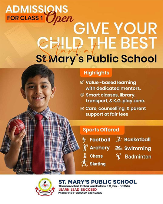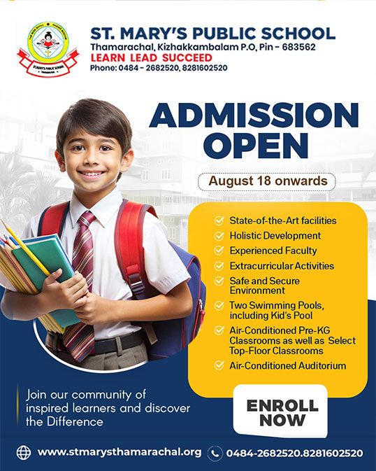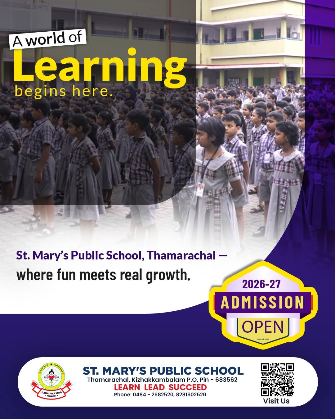 St. Mary's Public School, Thamarachal is located 1.5 kms from Kizhakkambalam in the suburbs of Aluva, rich with scenic beauty. It has good infra structure with digital class rooms, labs for Physics, Chemistry, Biology, Computer Science,Mathematics and also for English Language. It follows CBSE syllabus and is an ISO 9001:2008 certified institution. Apart from main subjects Dance, Music, Art, Yoga, Karate, Instrumental Music, Roller Skating & Swimming are also included as part of the syllabus